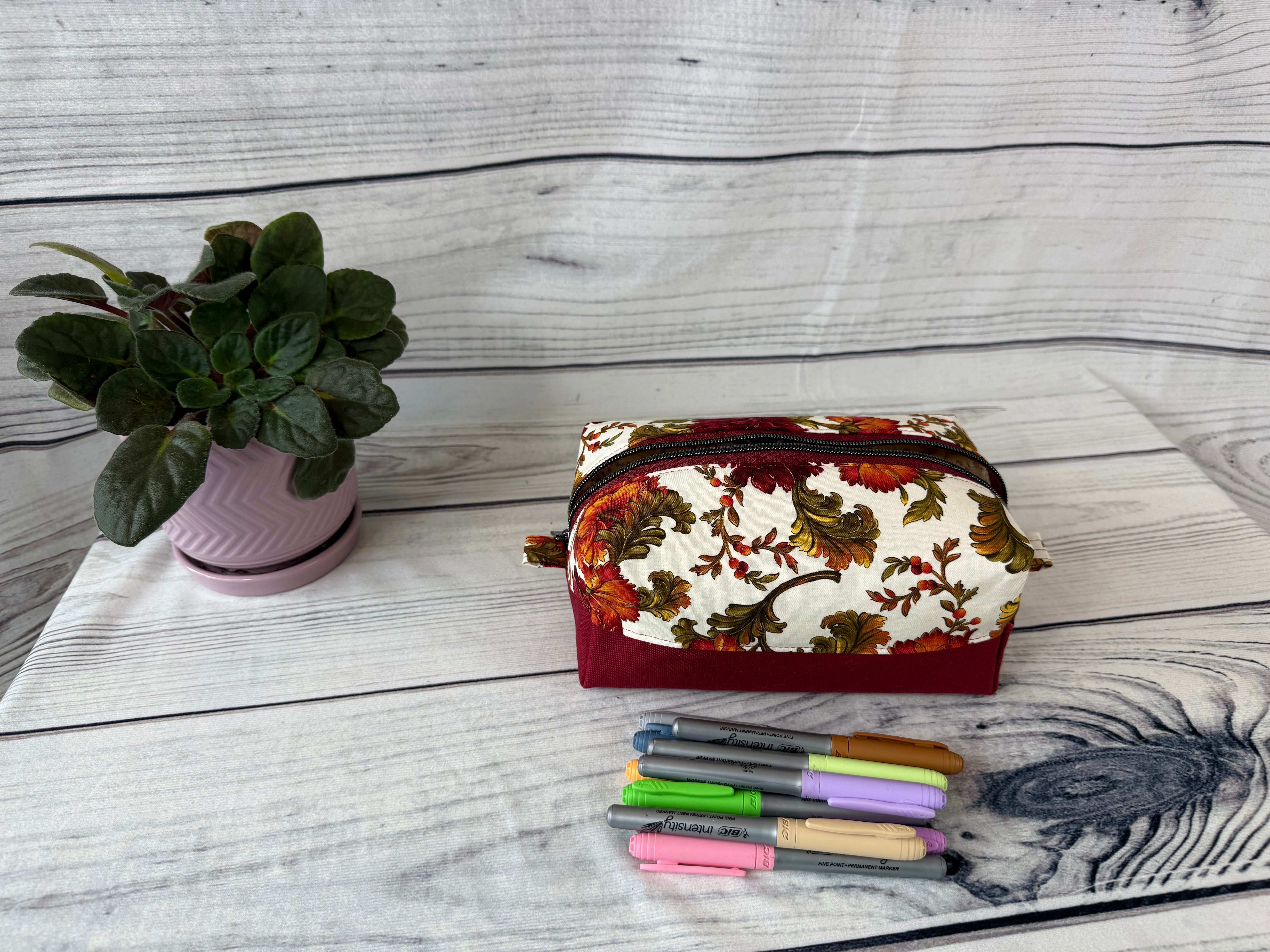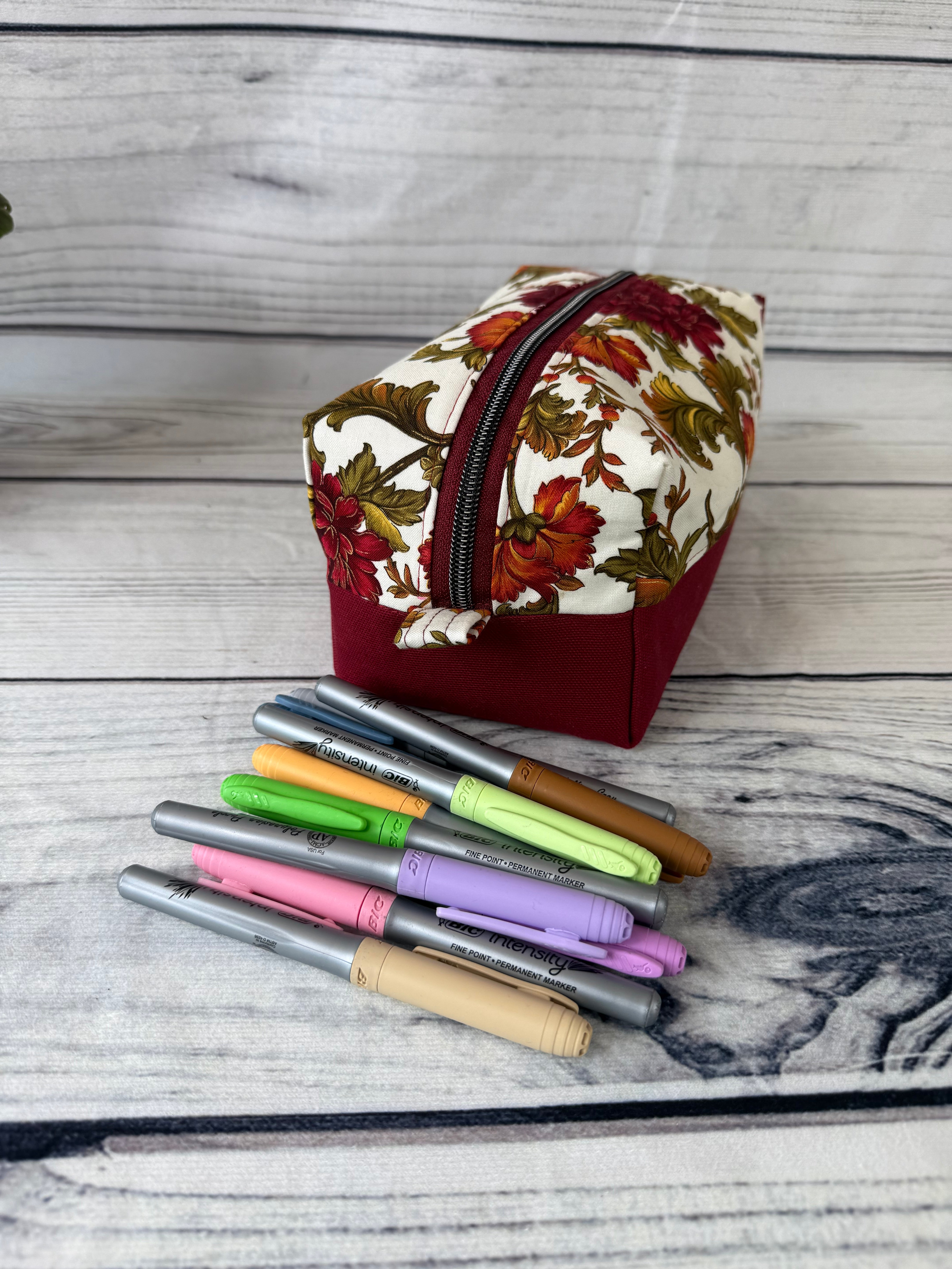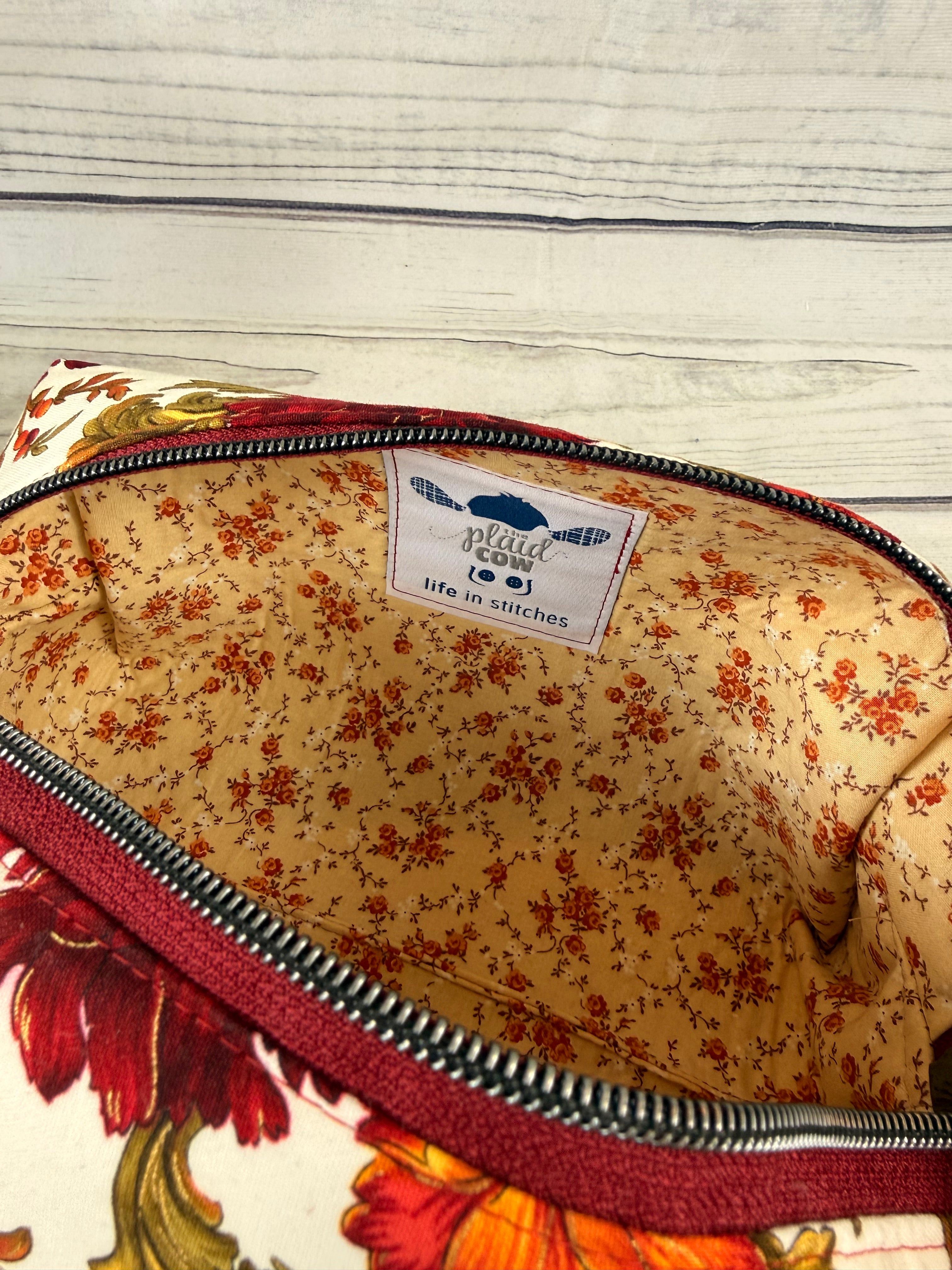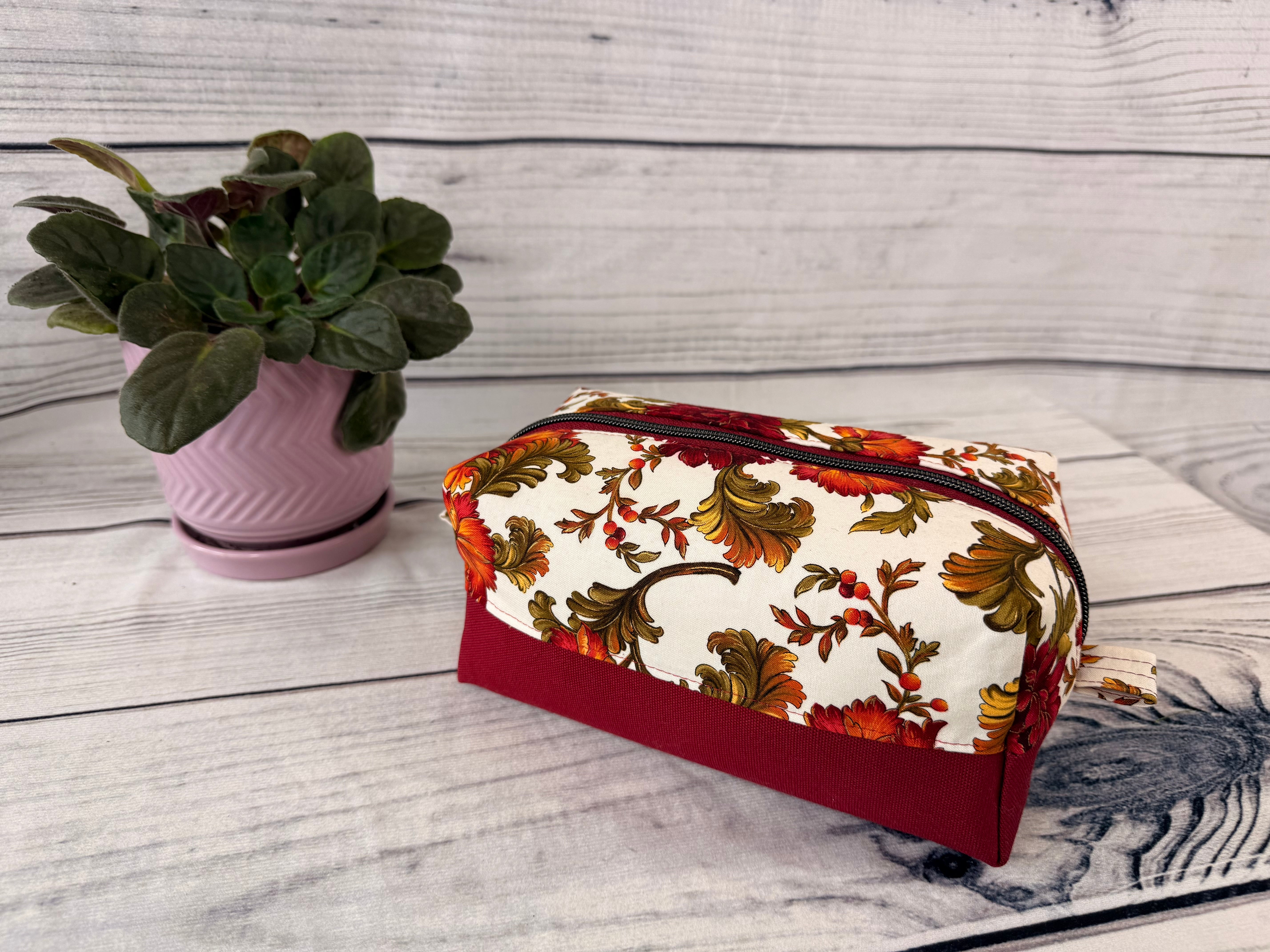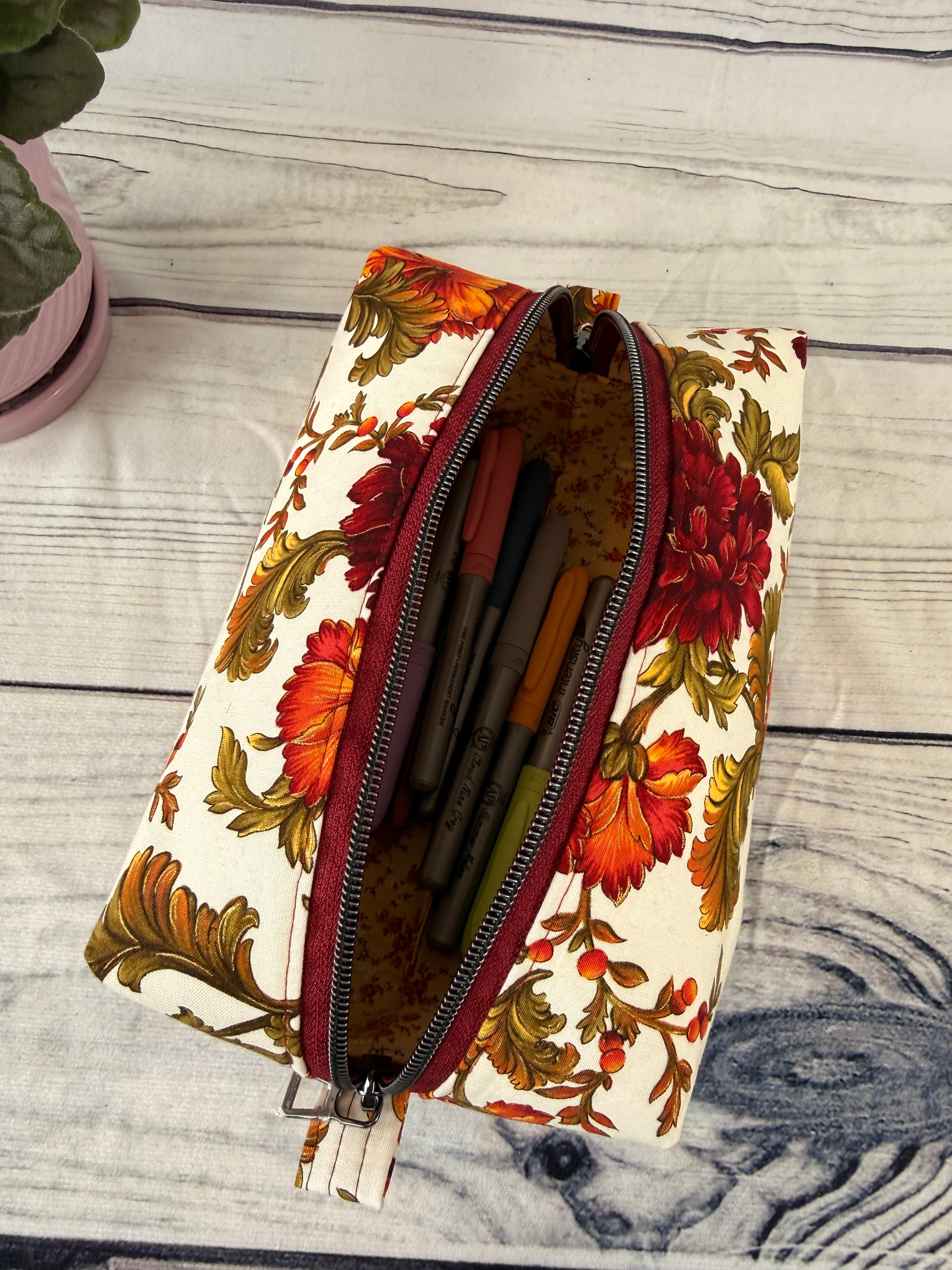 Choose this one of a kind pouch to elevate your storage game! This Boxy Pouch in a classic red & orange floral pattern is perfect for pencils, makeup brushes, or art supplies, its deep red canvas bottom adds durability, while the charming floral lining brings joy to organization. Discover the beauty of functionality with this delightful accessory!
