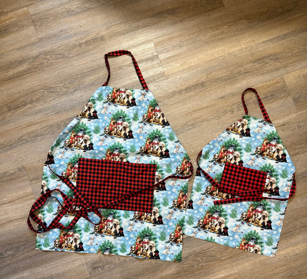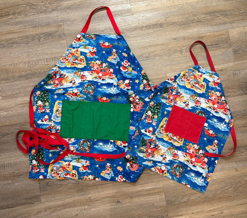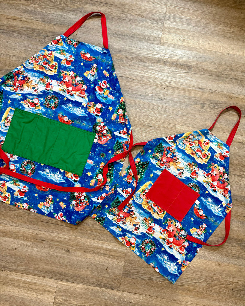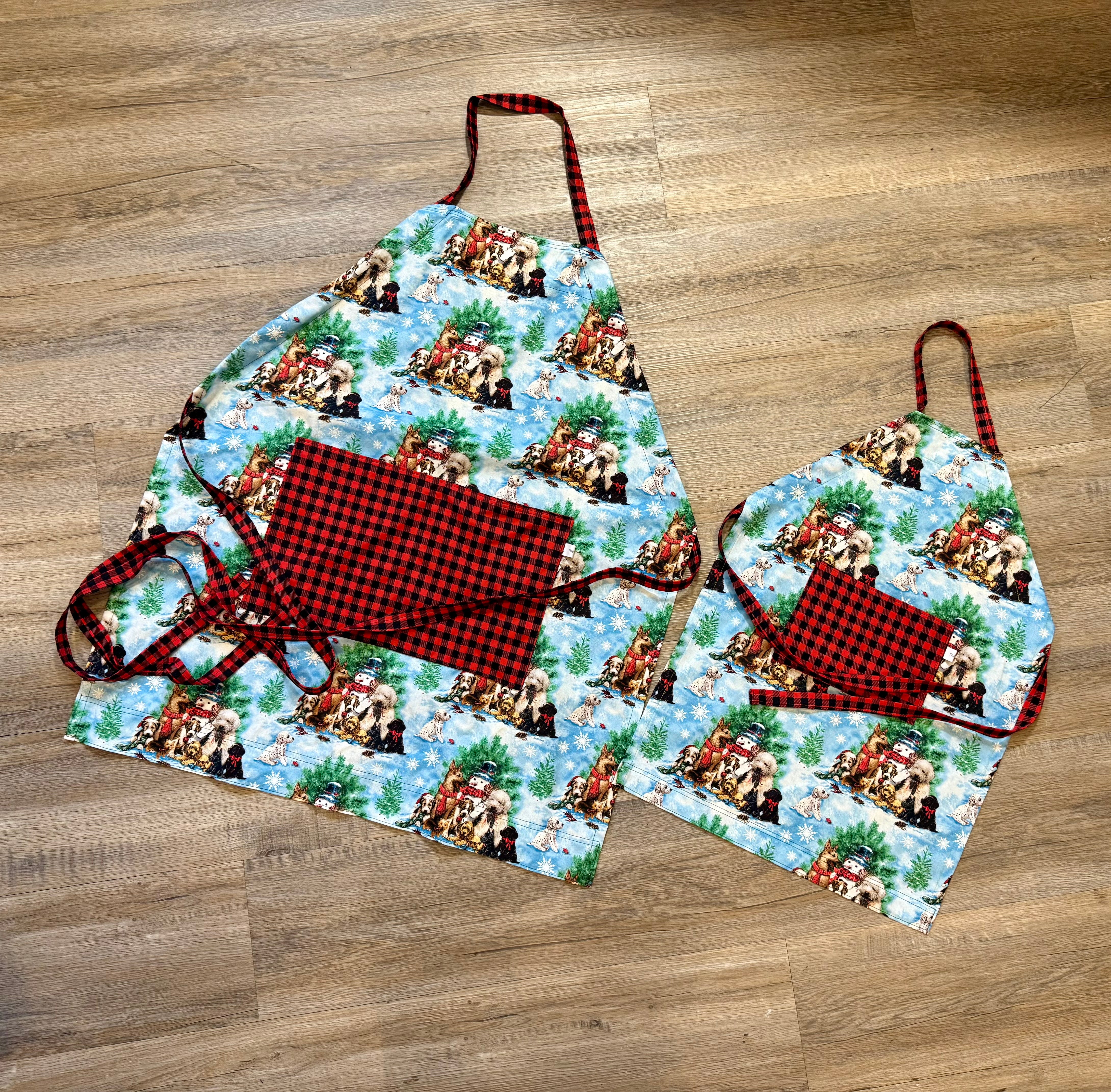 Create special holiday moments with your little one using this thoughtfully designed apron set. The kid-sized apron (17" W × 22" L) is approximately sized for ages 4–8, while the adult apron (26" W × 29" L) gives you room to work comfortably alongside them. Both feature festive Christmas themes, practical front pockets for small hands and supplies, and adjustable ties that grow with your child or adapt to different body types. Made from soft, durable 100% cotton, these aprons are built to withstand countless wash cycles. Quick-drying and easy to care for, they're designed with busy families in mind. Handcrafted with care in Perth, Ontario, this set celebrates the joy of cooking and baking together during the season.