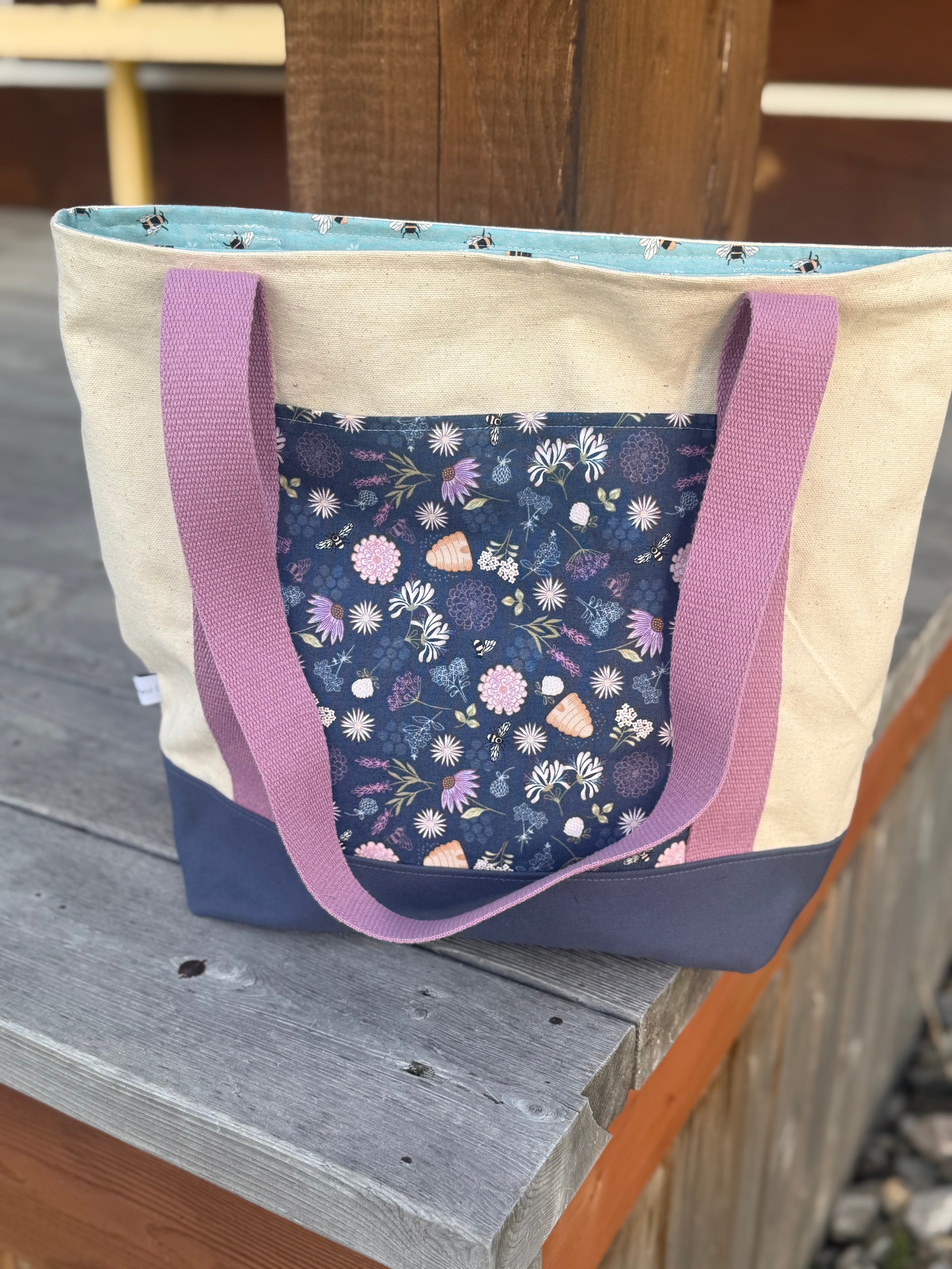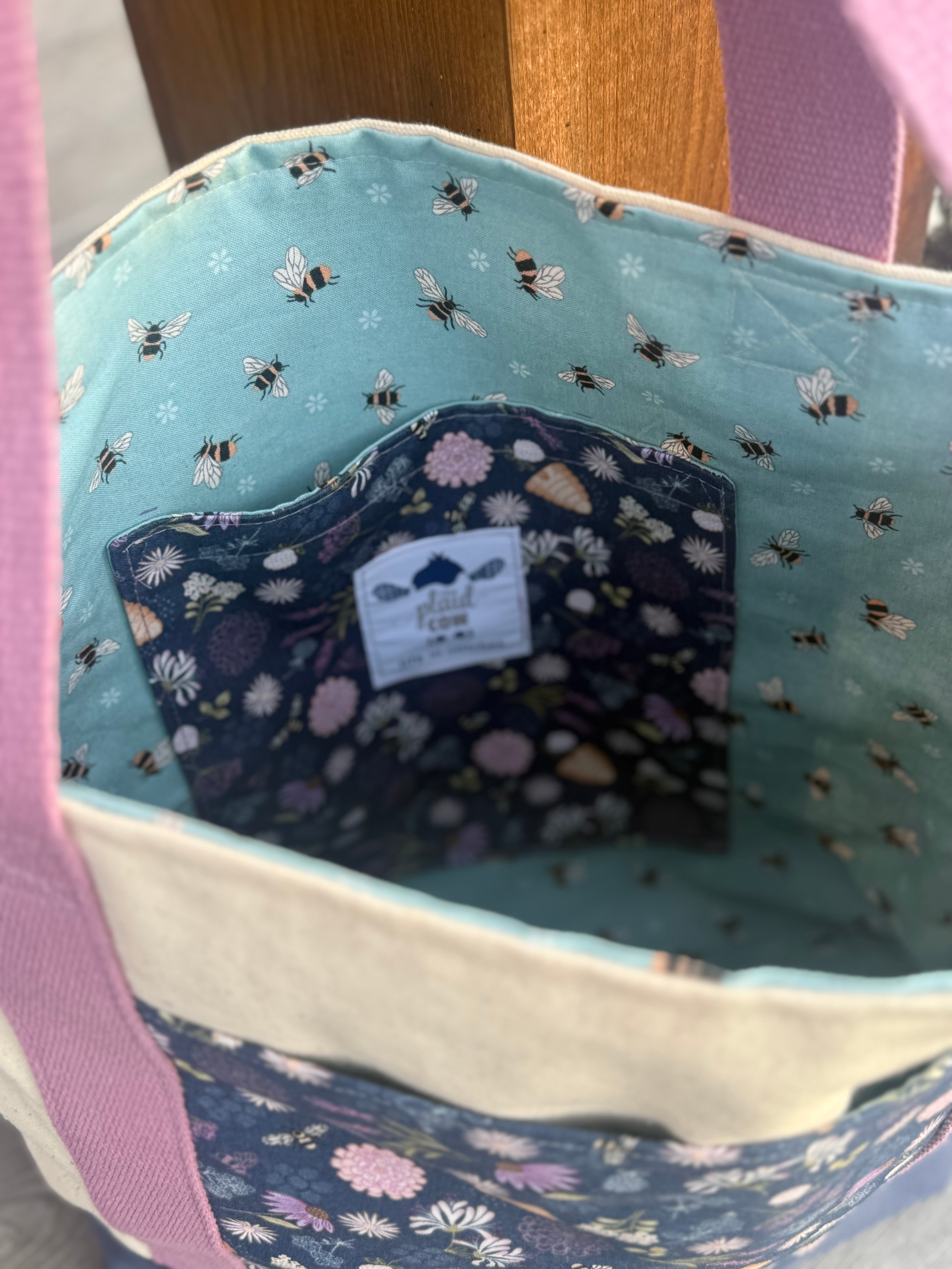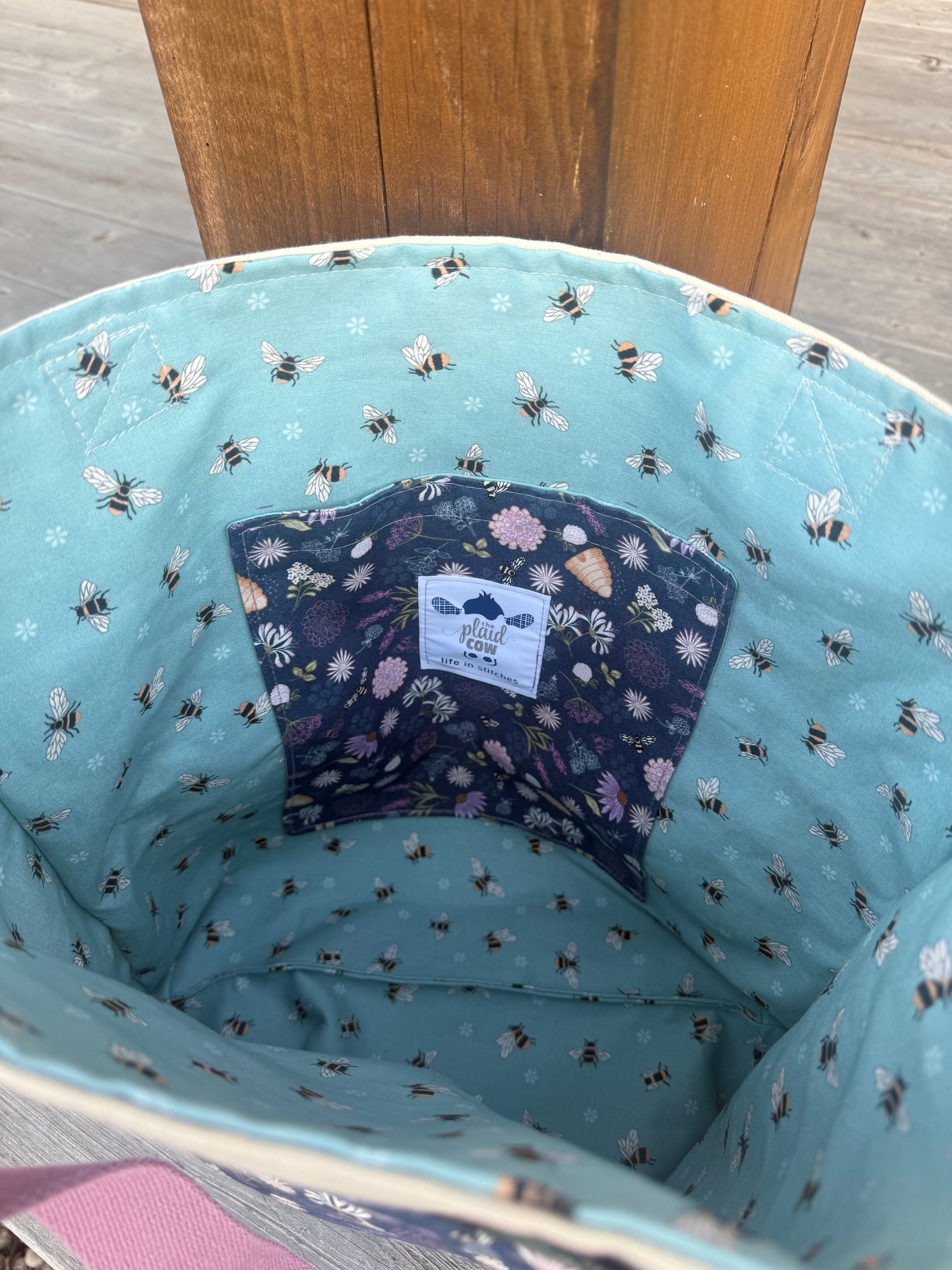 Inner pocket: Lined with the same light purple bee, flower & beehive print fabric
