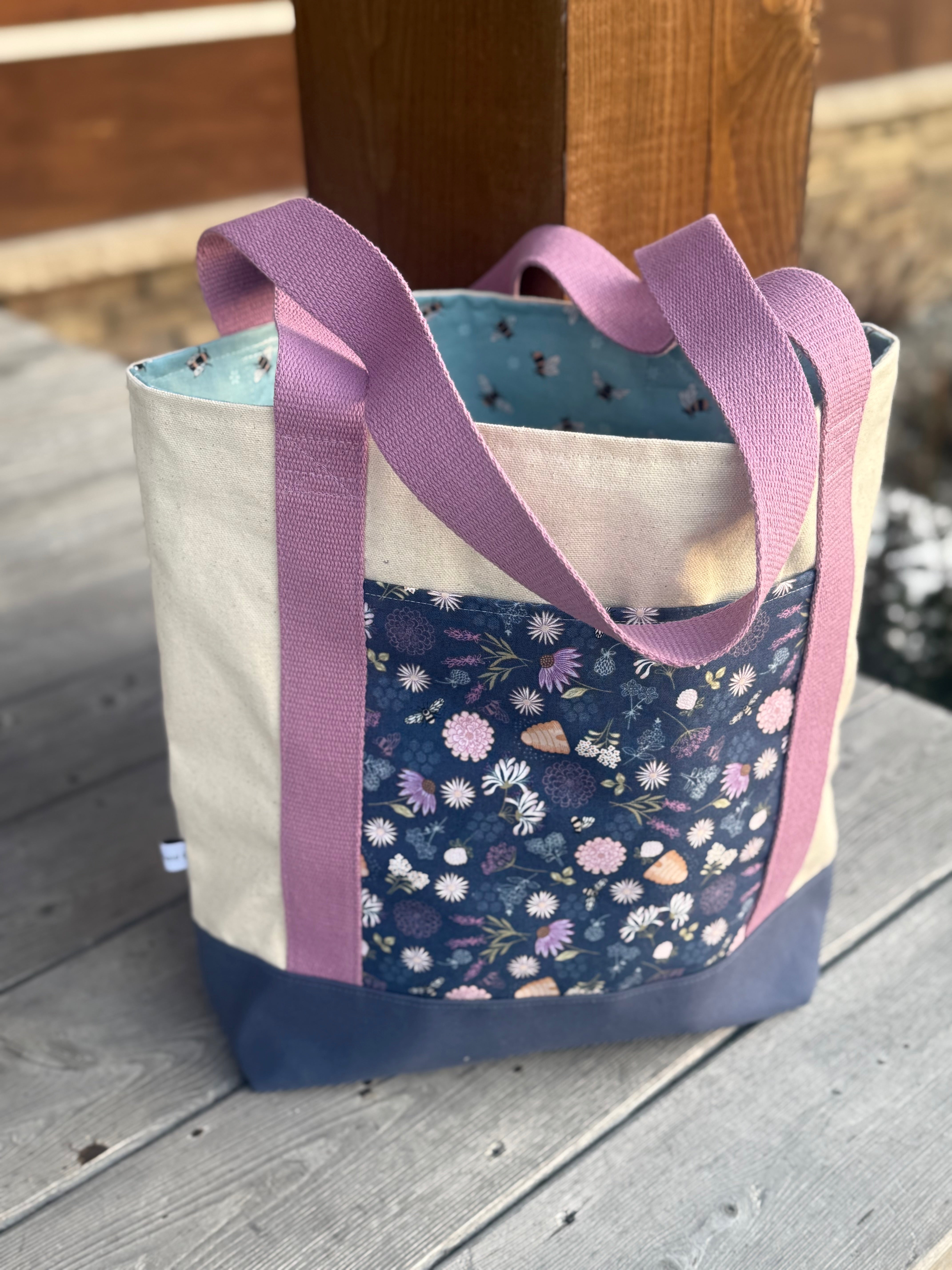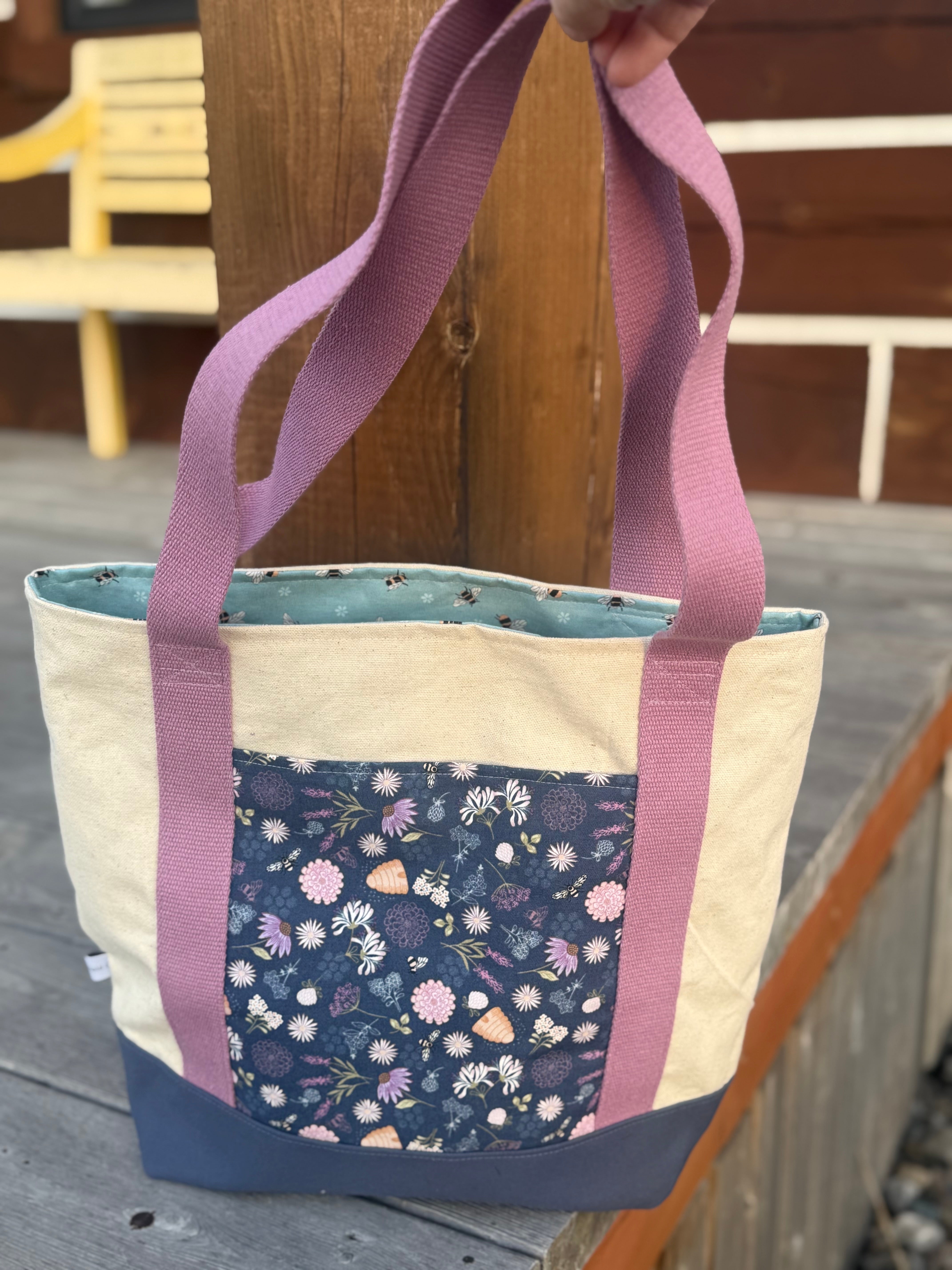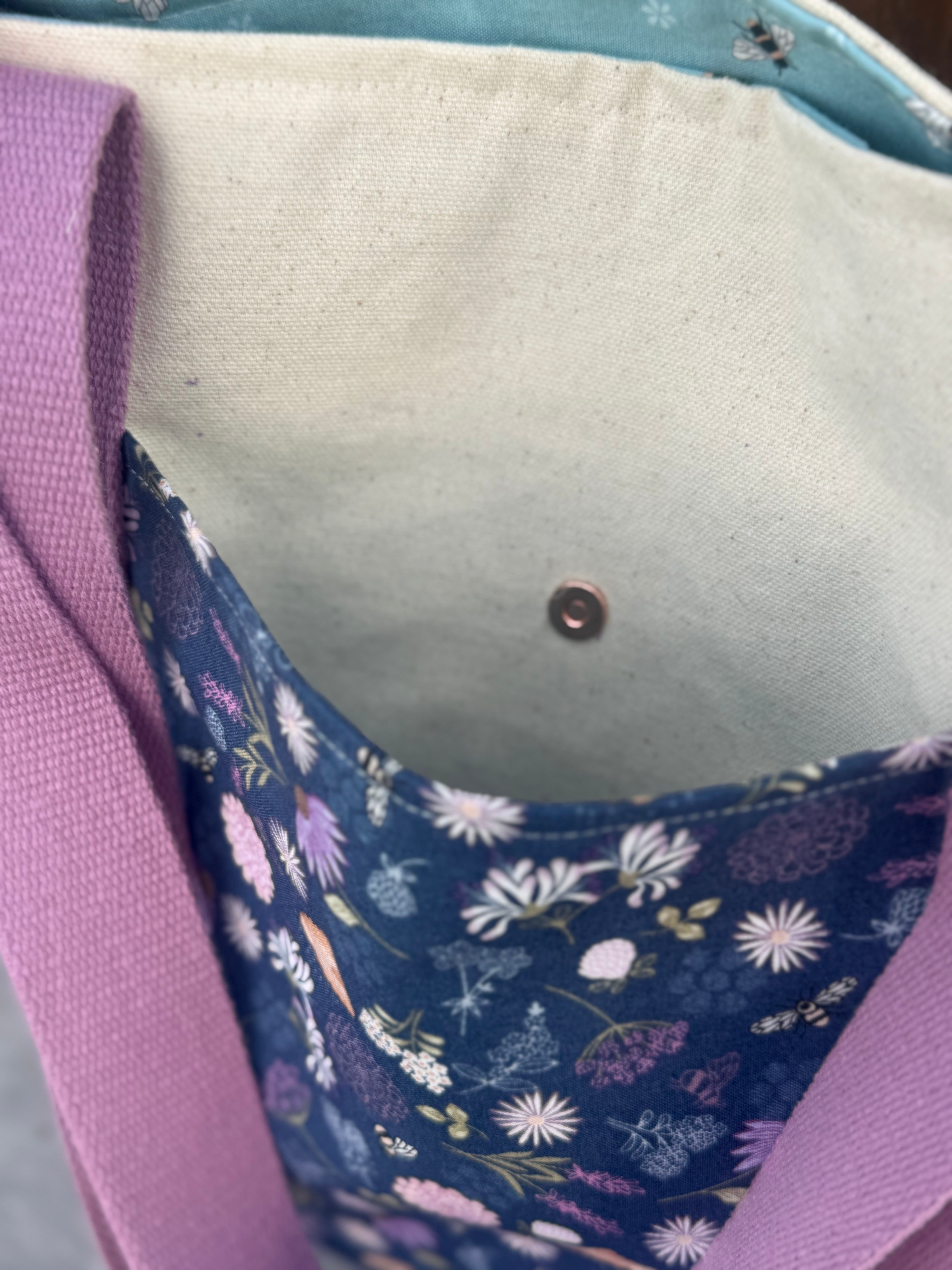 Inner pocket: Lined with the same light purple bee, flower & beehive print fabric