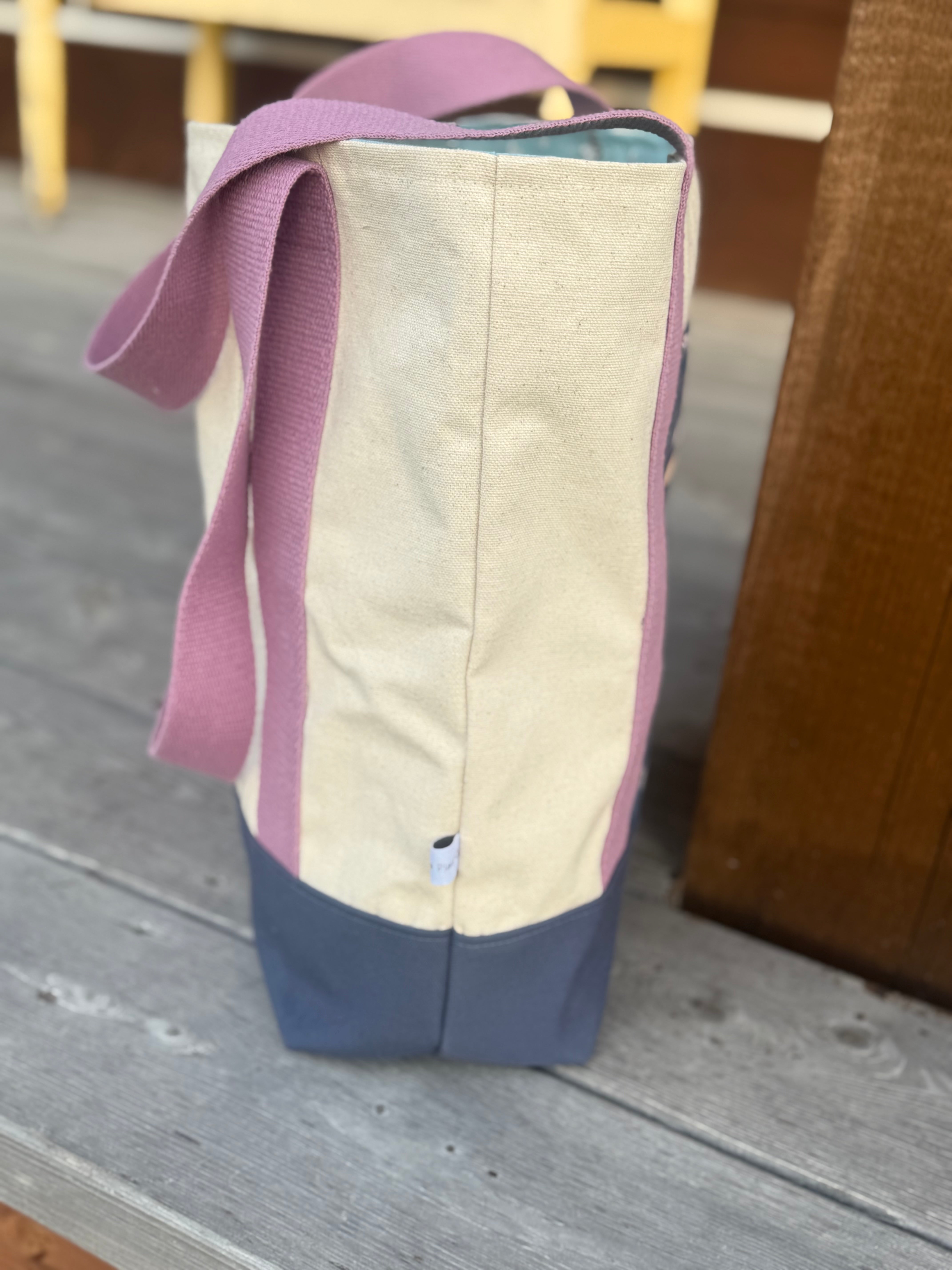 Straps: Lavender cotton canvas, 1½" wide — comfortable on the shoulder even when fully loaded