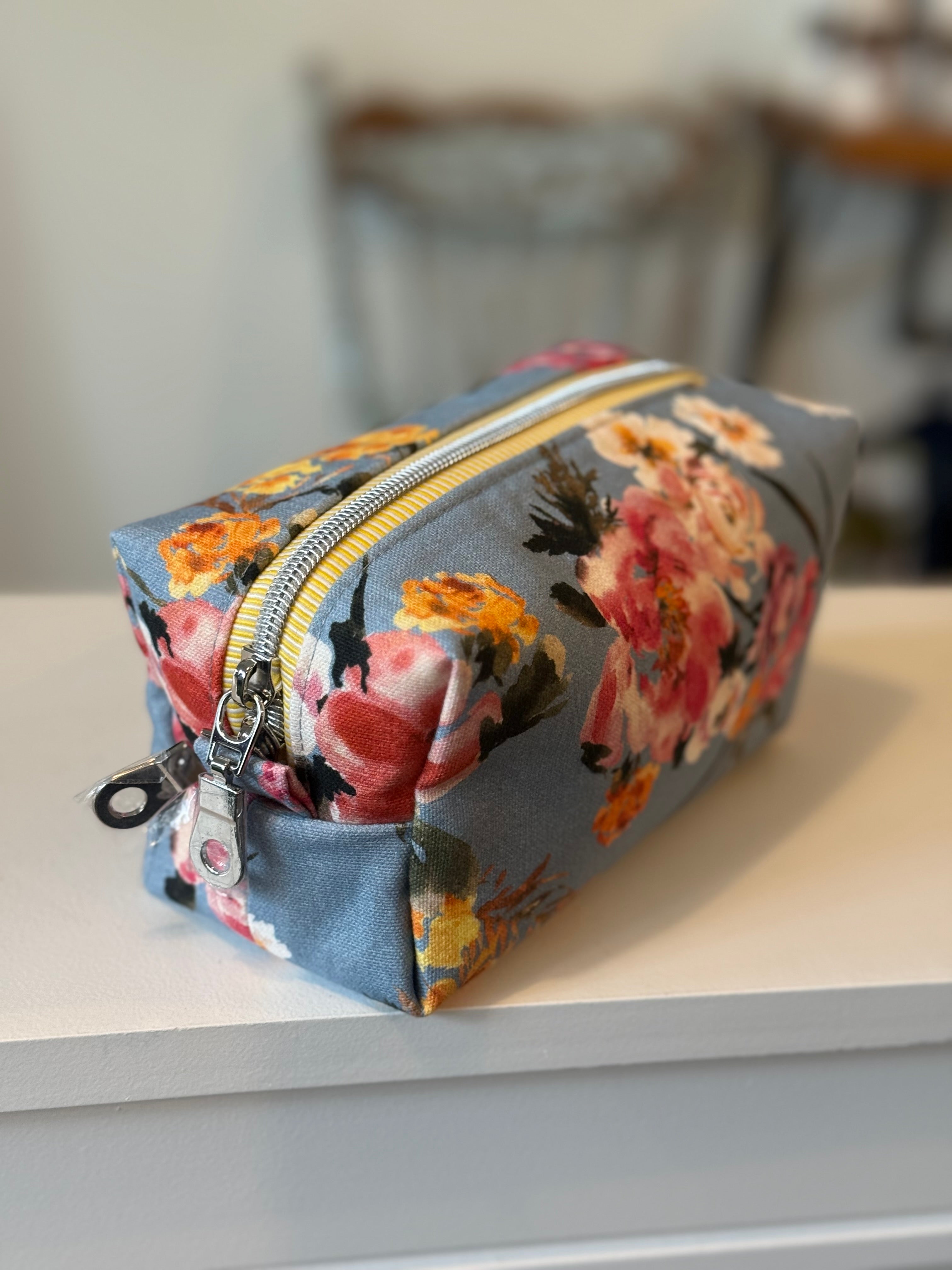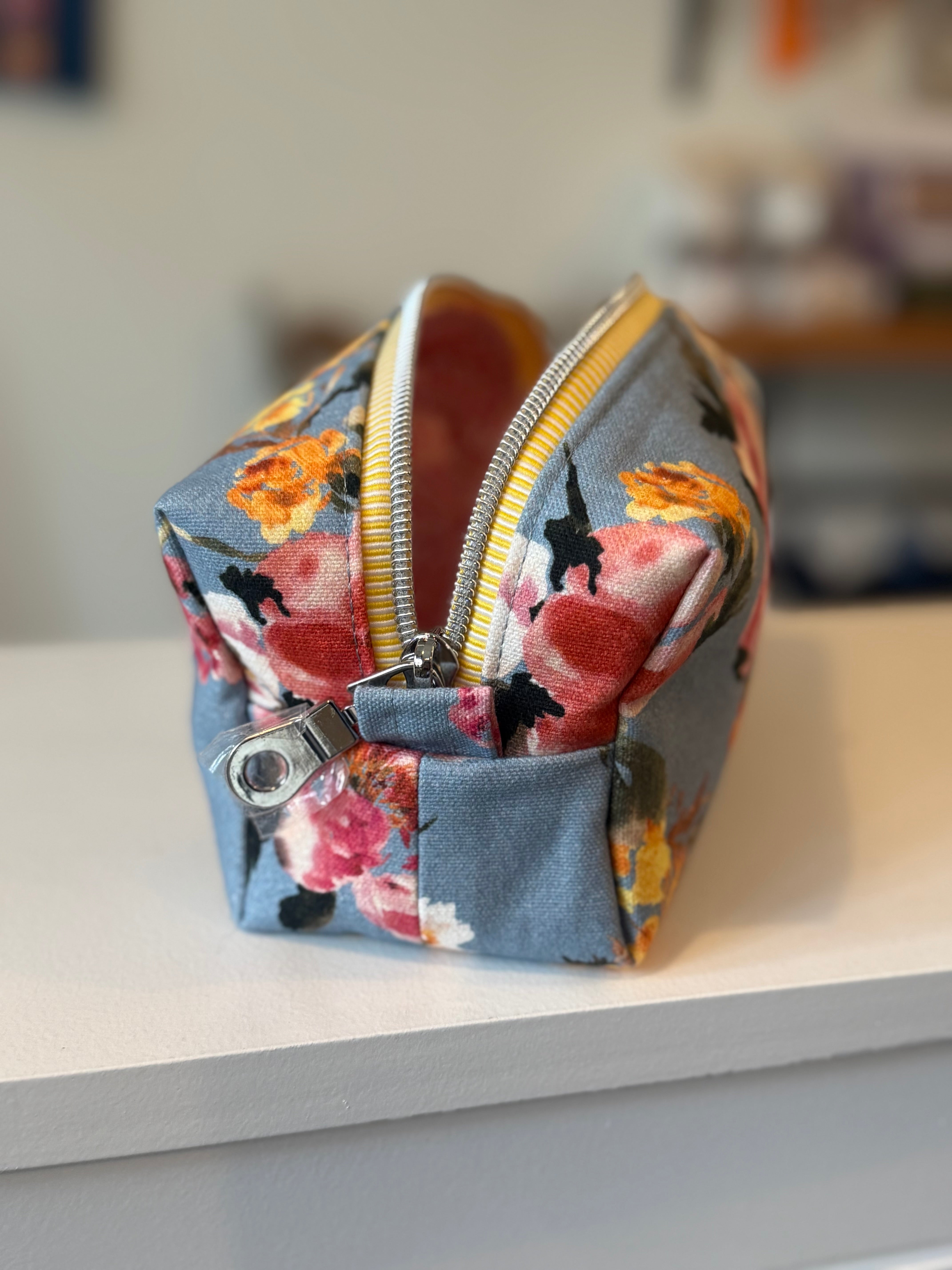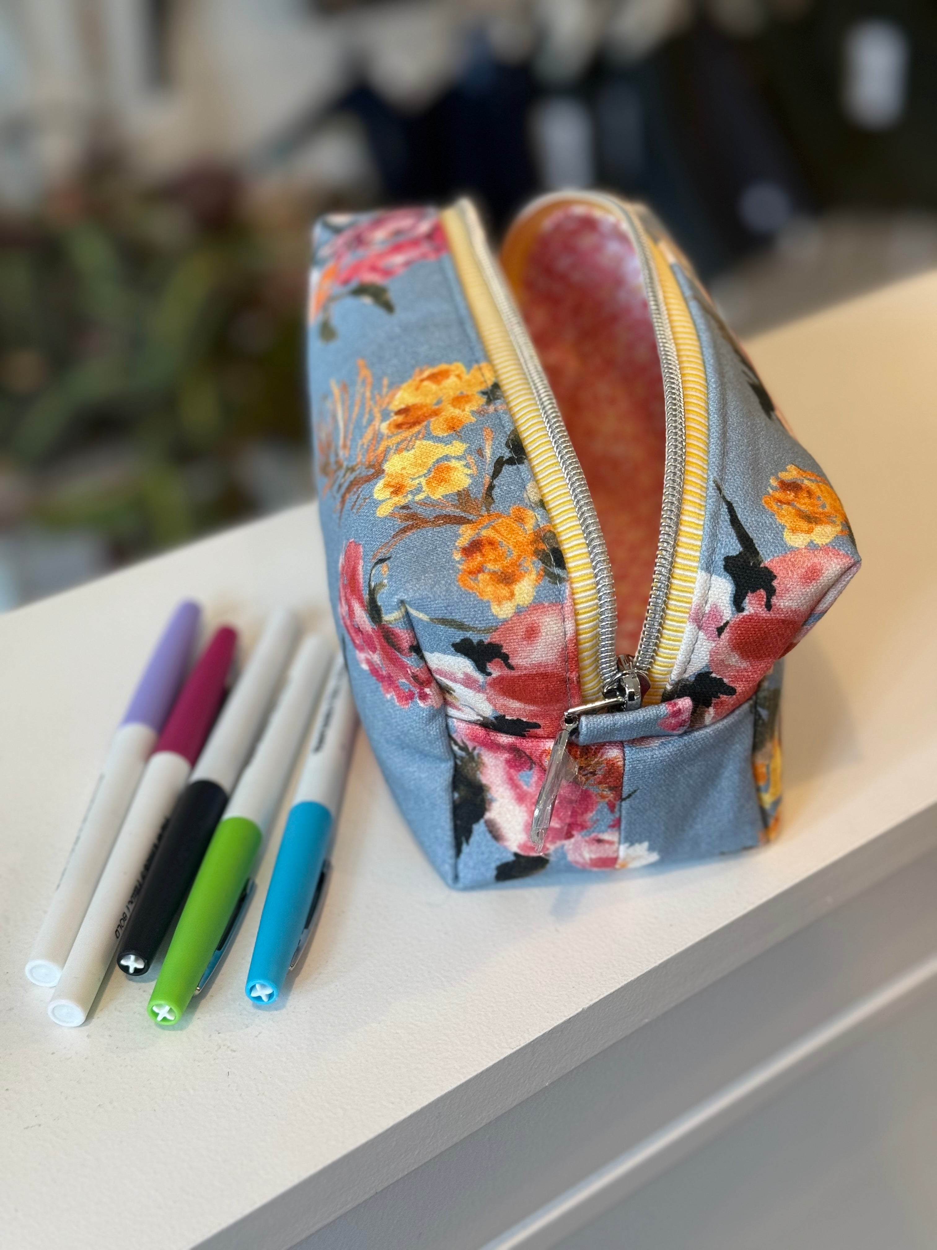 Made from durable 100% cotton canvas, it features a charming floral design against a rich blue background, complemented by a soft pink and yellow cotton lining. The sturdy boxy construction holds its shape, making it perfect as a pencil case, makeup organizer, or everyday catch-all. A cheerful yellow striped zipper adds a pop of color while ensuring secure closure. Whether you're storing art supplies, cosmetics, or small treasures, this practical pouch combines functionality with beautiful design.
