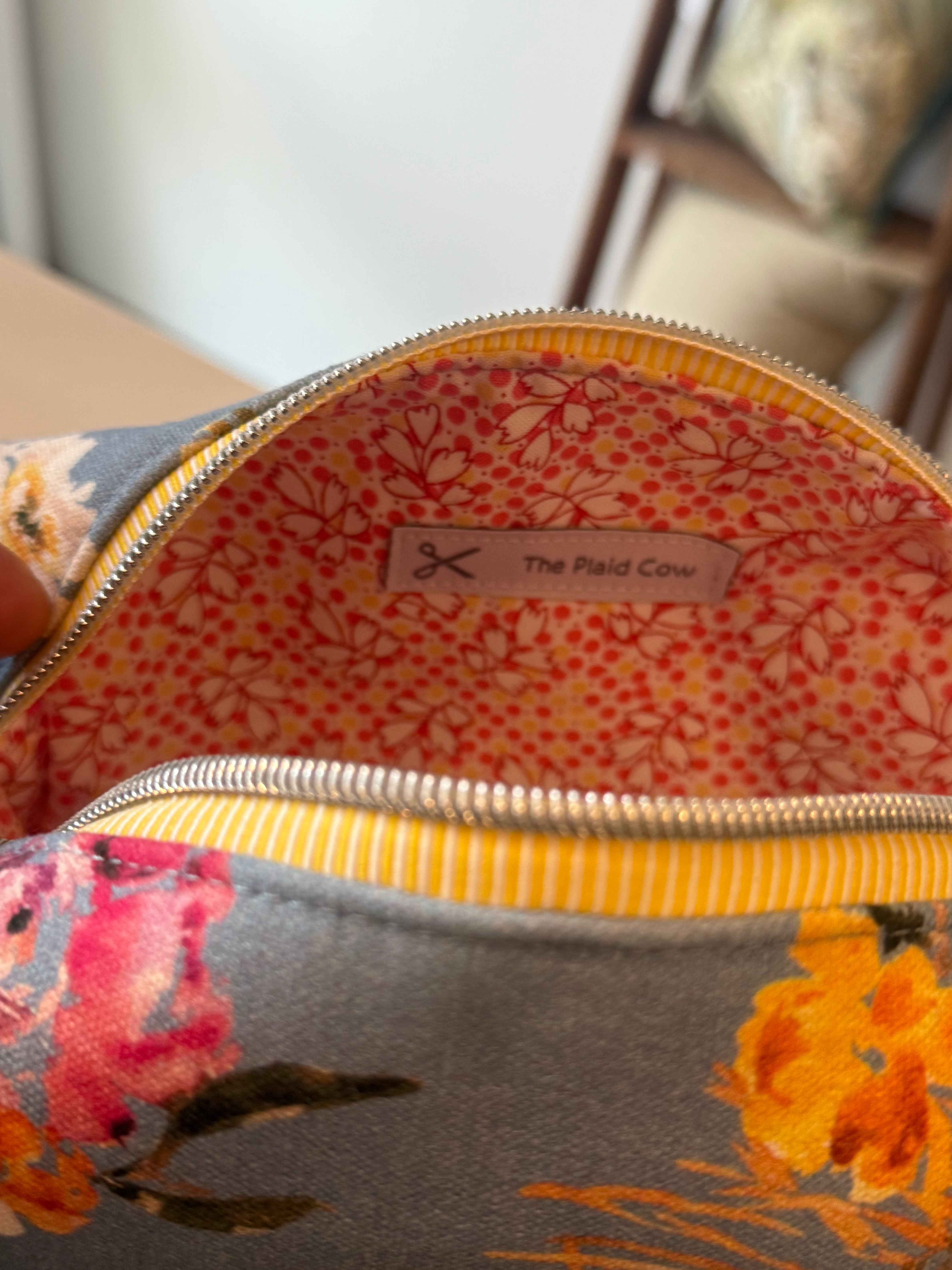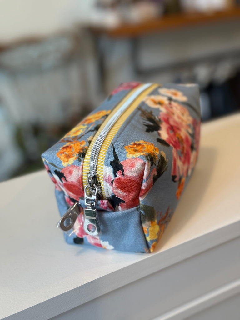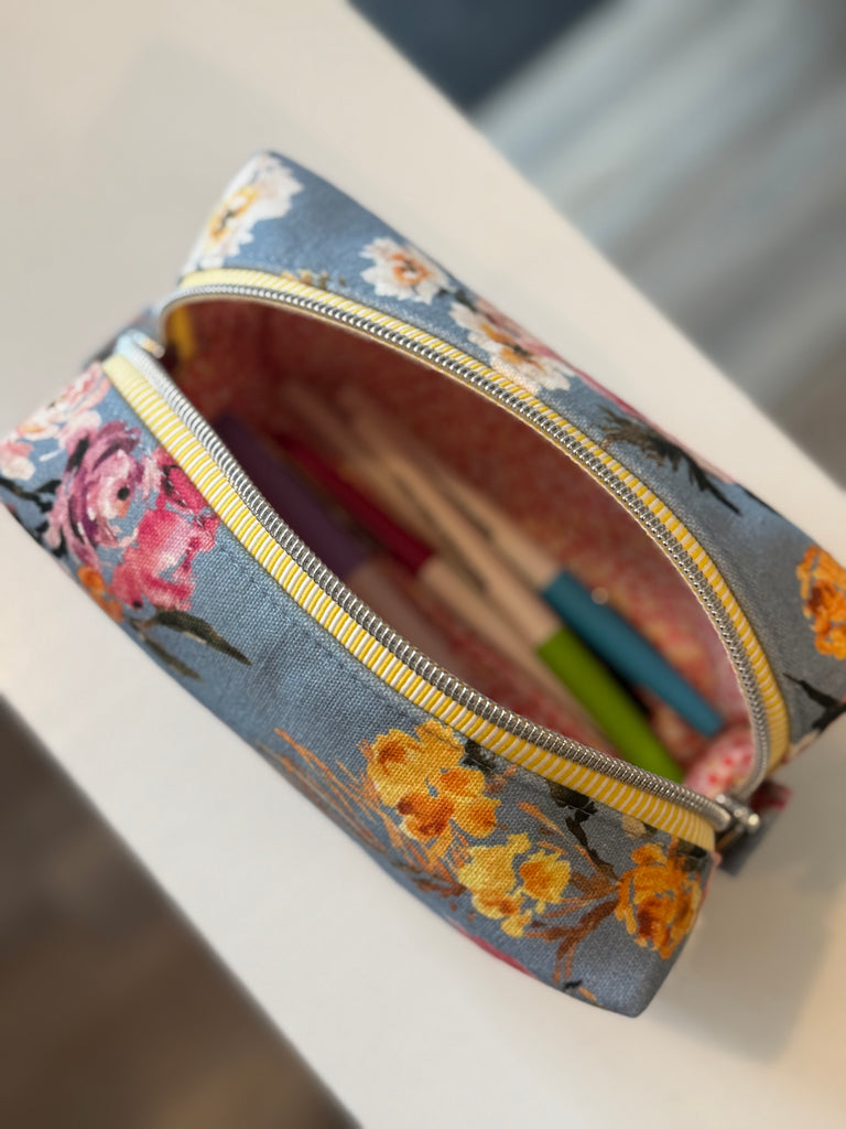 Made from durable 100% cotton canvas, it features a charming floral design against a rich blue background, complemented by a soft pink and yellow cotton lining. The sturdy boxy construction holds its shape, making it perfect as a pencil case, makeup organizer, or everyday catch-all. A cheerful yellow striped zipper adds a pop of color while ensuring secure closure. Whether you're storing art supplies, cosmetics, or small treasures, this practical pouch combines functionality with beautiful design.