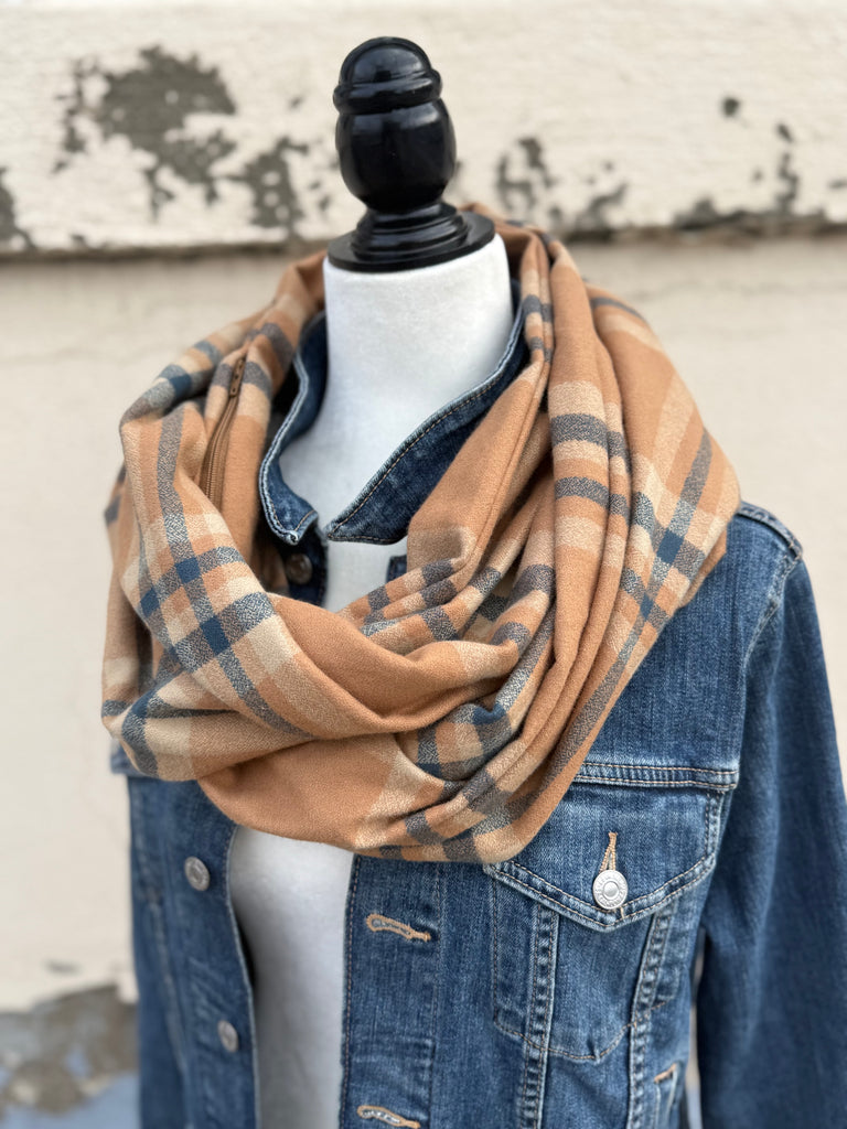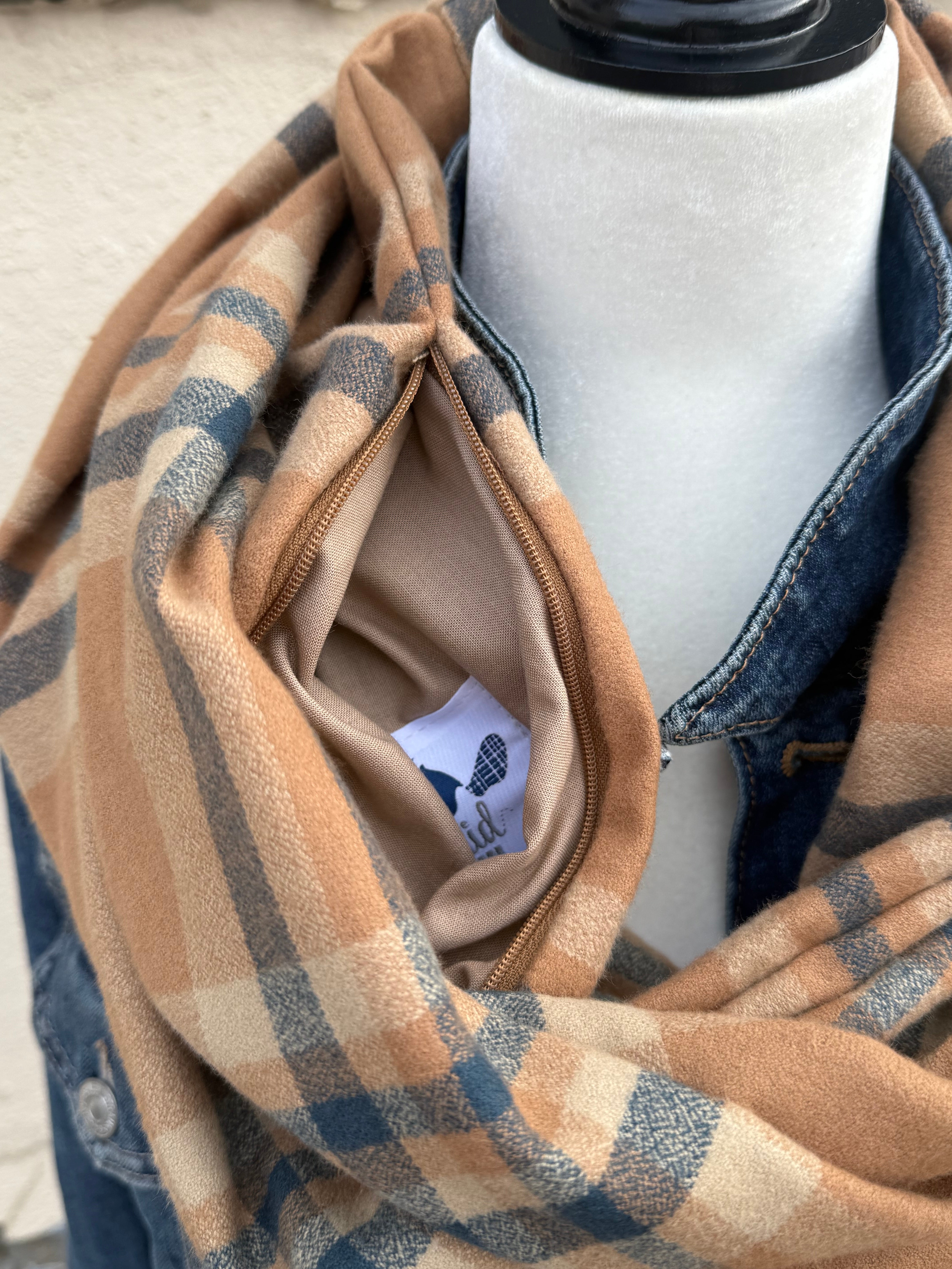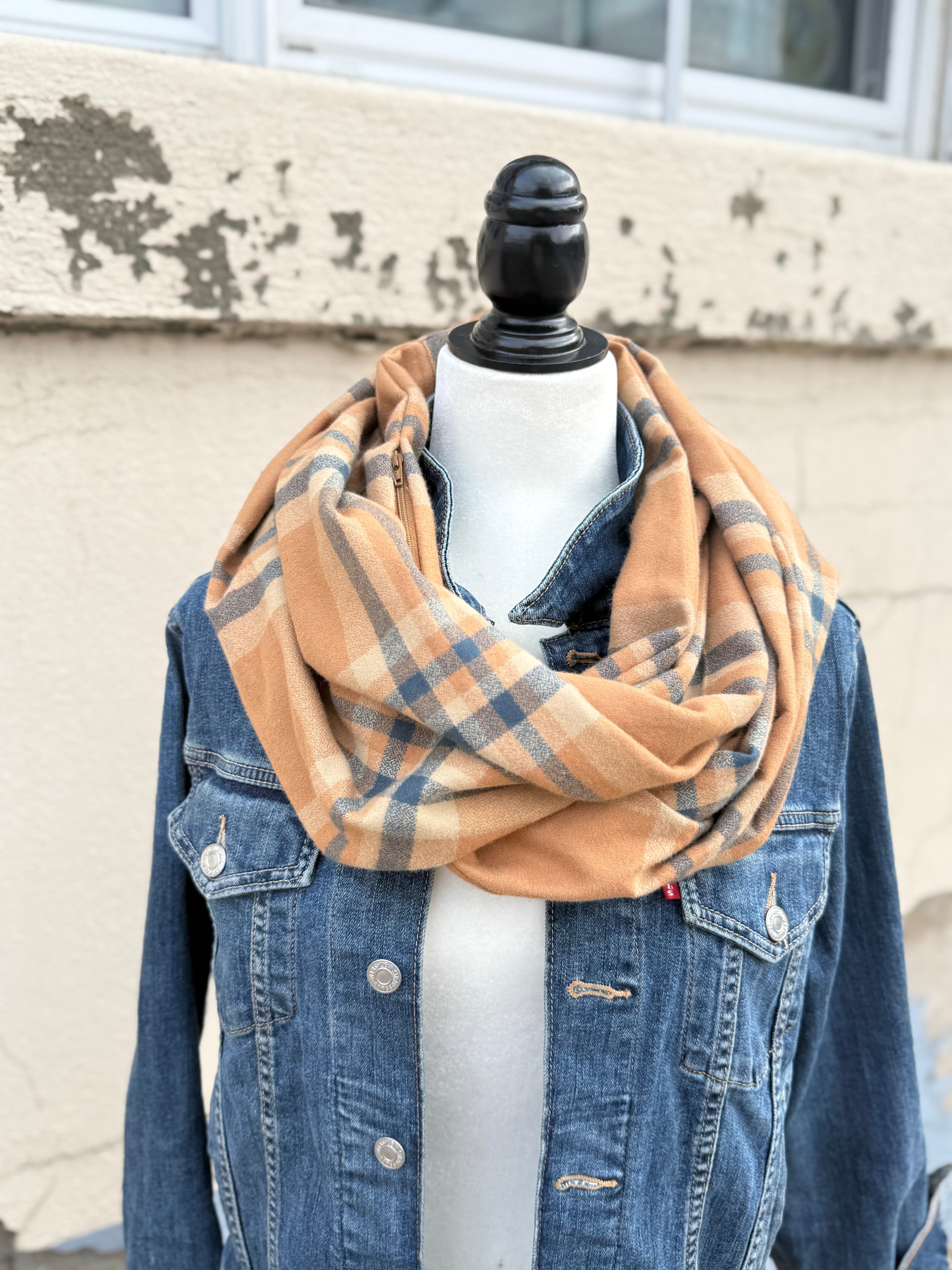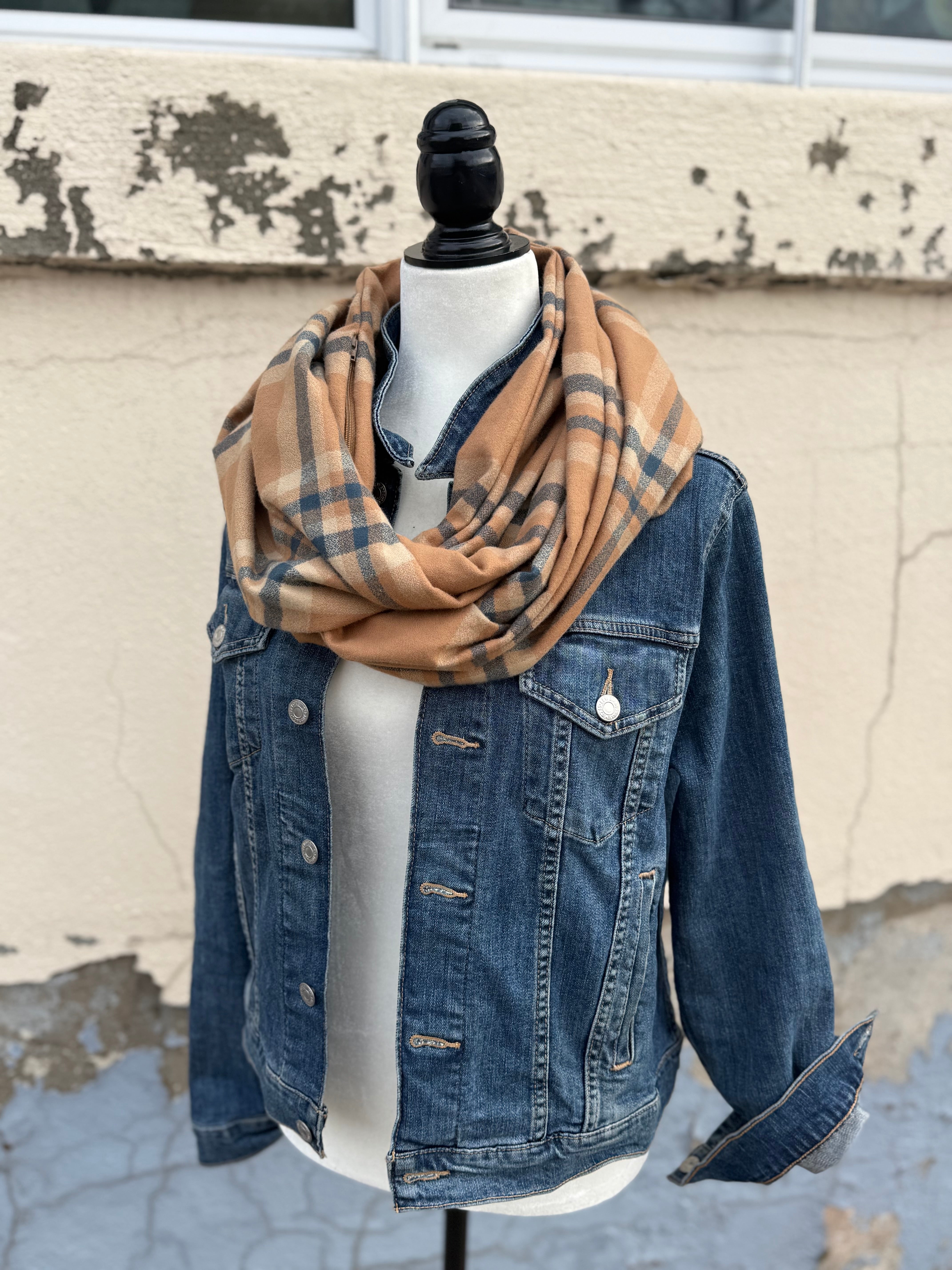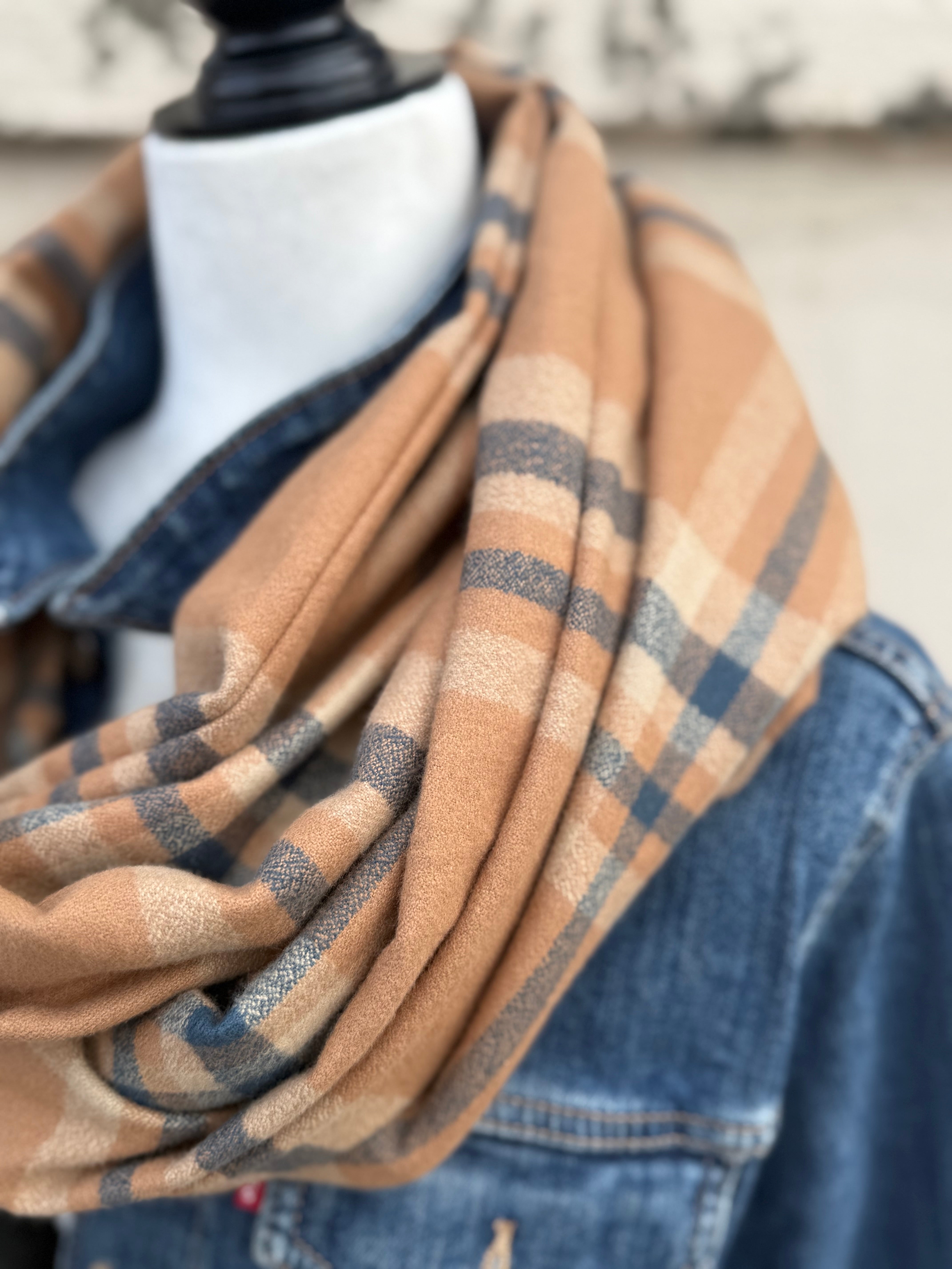 Experience the perfect blend of style and practicality with this neutral coloured plaid infinity scarf. Soft camel, light beige & navy blend beautifully to offer a subtle neutral coloured scarf! The perfect accessory for your winter wardrobe.