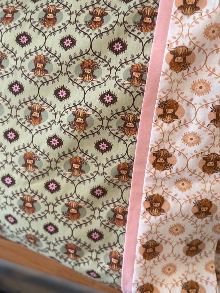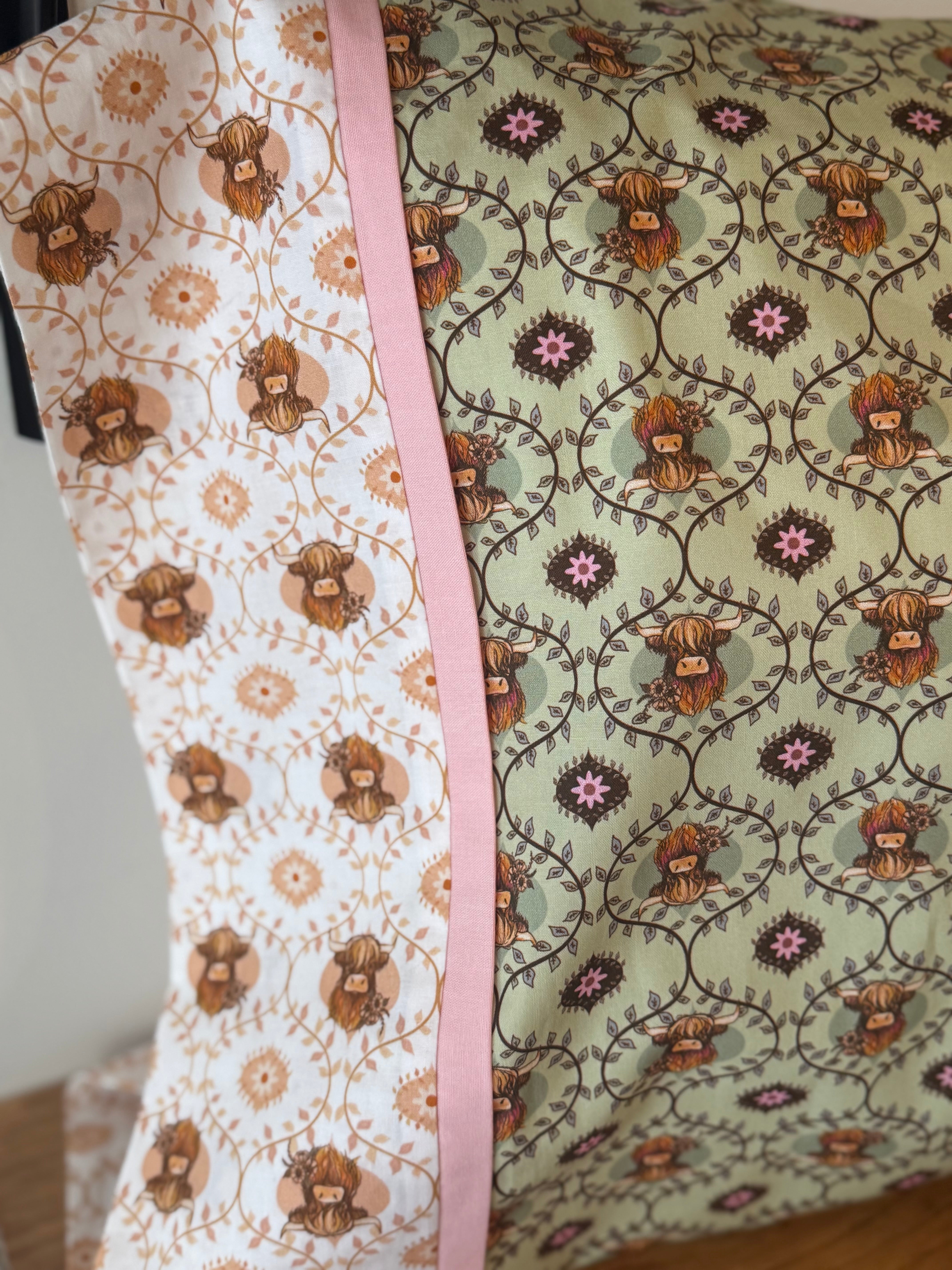 Bring a touch of country charm to your bedroom with this adorable Highland cow pillowcase! Made from 100% soft quilting cotton, it features sweet Highland cows surrounded by soft shades of light green, pink, and warm browns on a crisp white background. Standard size, perfect for adding a little farmhouse flair (and a lot of cuteness) to your bedding.